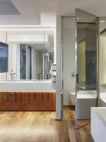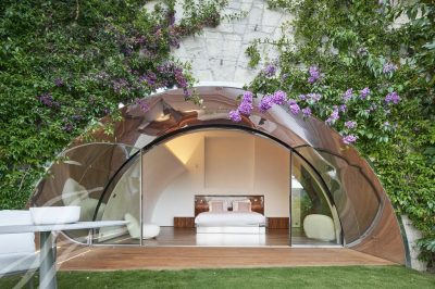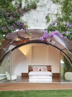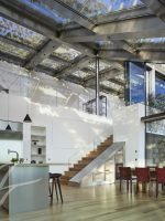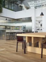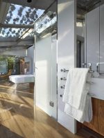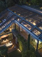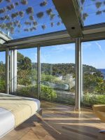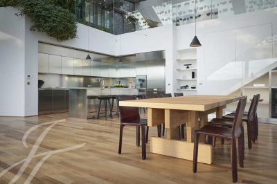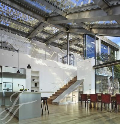 The sitting and dining room and also the radically contemporary kitchen benefits from the double heights of the ceiling. The ceiling … in glass! With a specail treatment, of course, and that may be blinded by some special automatic curtains.