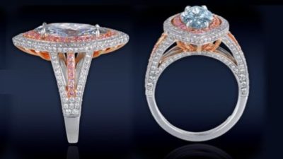 Natural Fancy Blue Marquise Diamond Ring Featuring A Magnificent 2.44Ct. GIA Certified, Natural Fancy Gray Blue, Internally Flawless Marquise Diamond. Surrounded By Pave’ Set White And Pink Diamonds, Total Carat Weight 1.72Ct. Mounted In 18K White And Rose Gold.